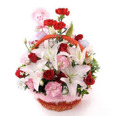 花材:紅色、粉康乃馨各10枝,百合2枝,紅玫瑰8枝,白色系小花綠色葉材;