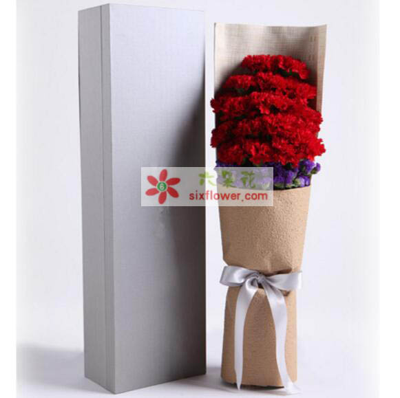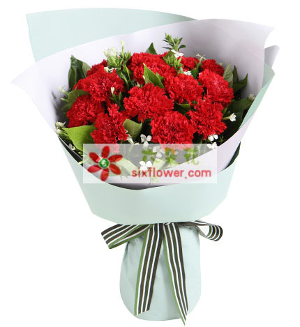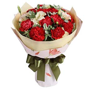 材 料:紅色康乃馨16枝,白色相思梅2枝,梔子葉0.5扎;