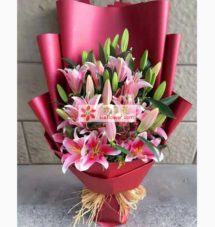花材:12枝粉色多頭香水百合,綠葉搭配。